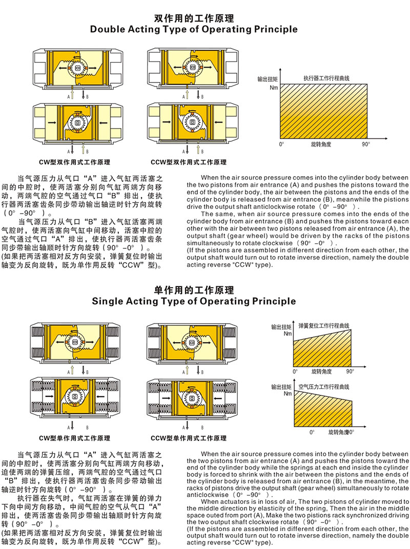 AT氣動執行器又有角行程氣動執行器和直行程氣動執行器兩種。隨著氣動執行器智能化的不斷發展,智能閥門定位器成為其不可缺少的配套產品。智能閥門定位器內裝高集成度的微控制器,采用電平衡(數字平衡)原理代替傳統的力平衡原理,將電控命令轉換成氣動定位增量來實現閥位控制;利用數字式開、停、關的信號來驅動氣動執行機構的動作;閥位反饋信號直接通過高精確度的位置傳感器,實現電/氣轉換功能。