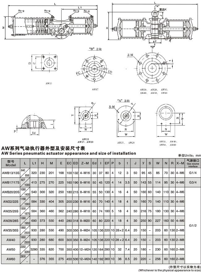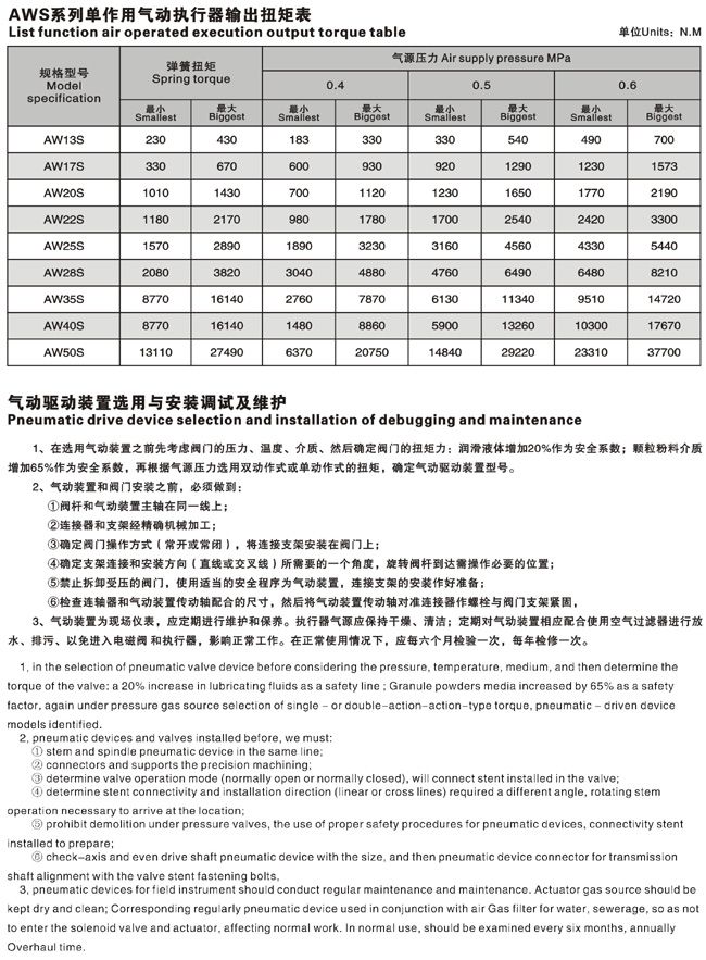 AW系列氣動(dòng)執(zhí)行器分為雙作用式和單作用式(彈簧復(fù)位),兩個(gè)公體氣缸,輸出扭矩大,動(dòng)作靈活平衡;活塞桿鍍硬鉻,有很好的耐磨性;所有滑動(dòng)部件之間配有無(wú)油潤(rùn)滑軸和導(dǎo)向環(huán)以降低摩擦系數(shù),延長(zhǎng)使用壽命AW系列氣動(dòng)執(zhí)行器的U器曲線特性輸出扭矩更適用于大口徑球閥等轉(zhuǎn)角行程閥門的啟、閉和調(diào)節(jié),也可用于其它回轉(zhuǎn)運(yùn)動(dòng)場(chǎng)合,是實(shí)現(xiàn)工業(yè)管道自動(dòng)化控制的理想裝置。
